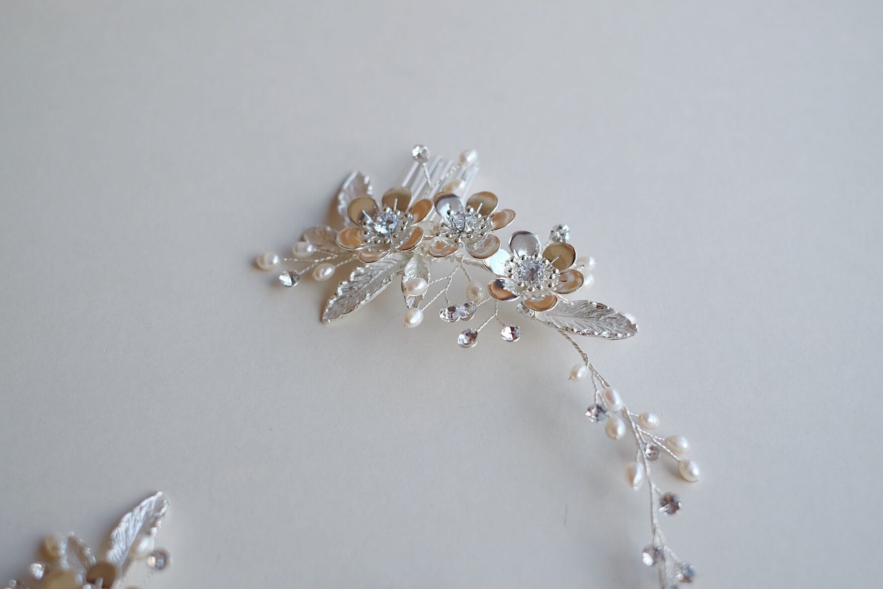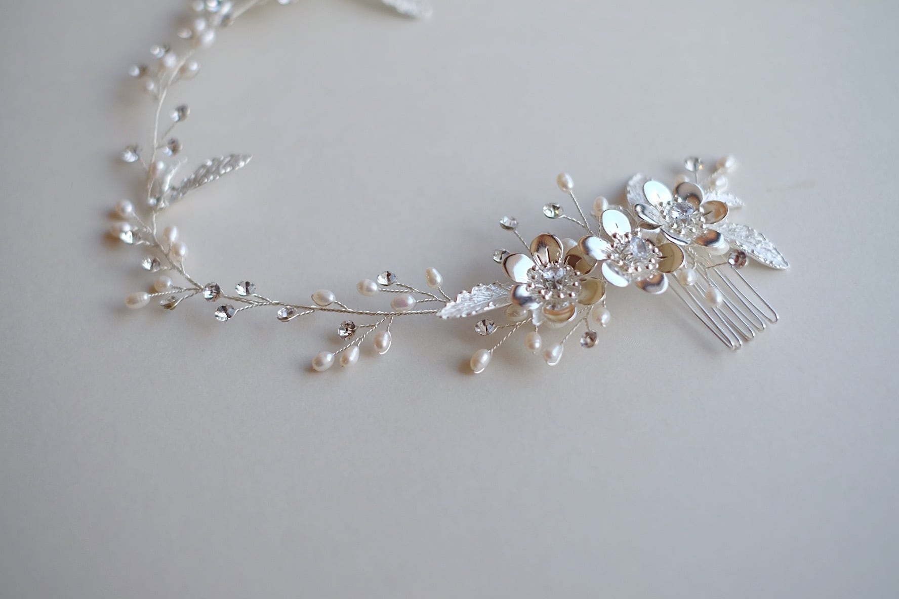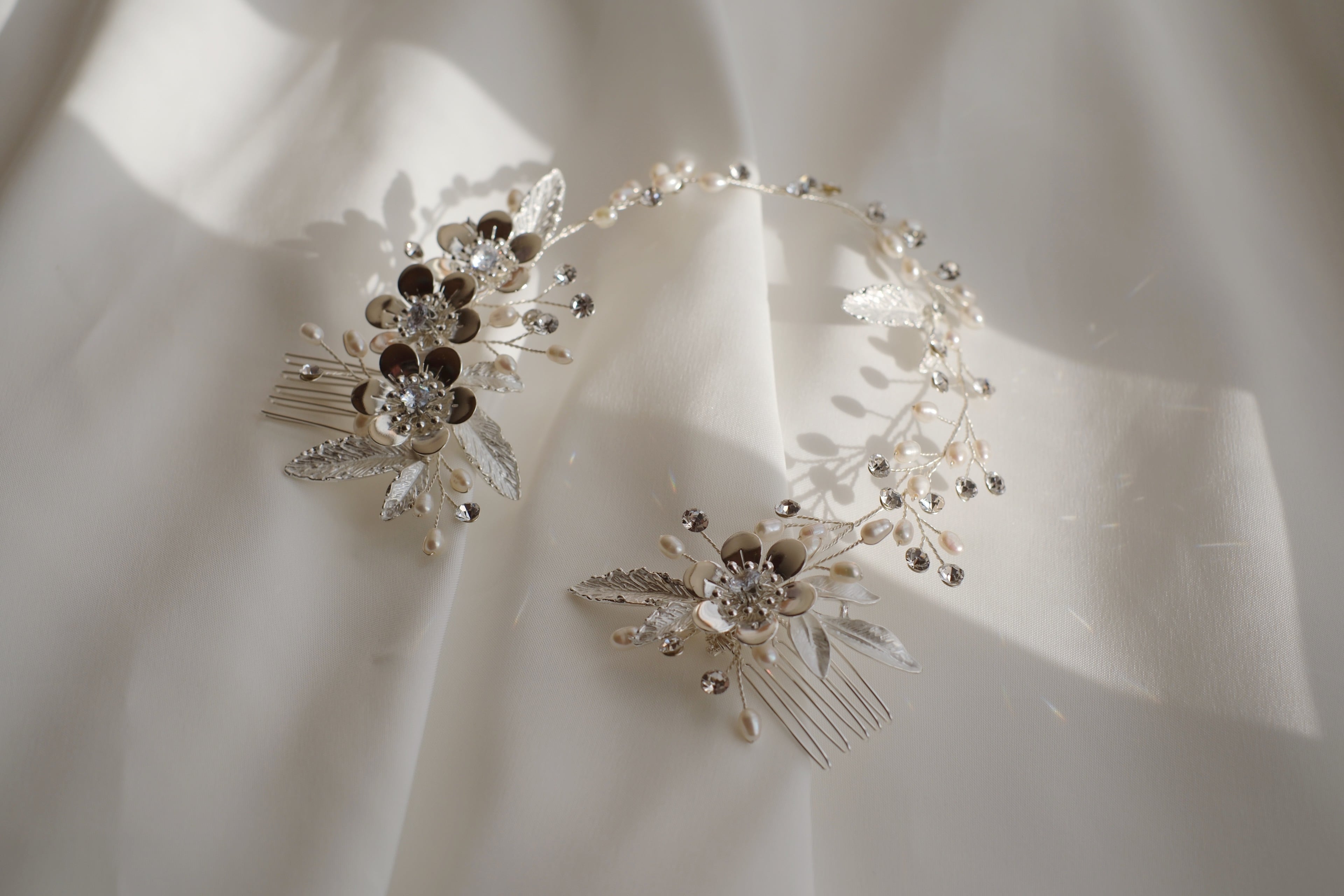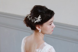 フラワーやリーフ、ボタニカルなモチーフと、淡水パールやラインストーンを一緒にワイヤーで丁寧に紡いた、ナチュラルな小枝ヘッドドレス。